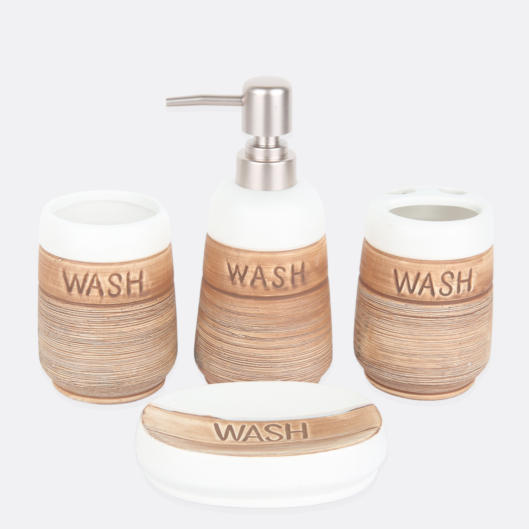 - 1 Soap Dispenser, 1 Tumbler, 1 Soap Dish, 1 Brush Holder